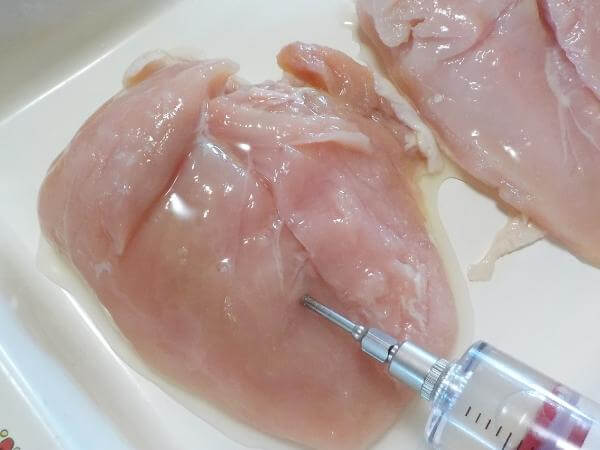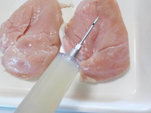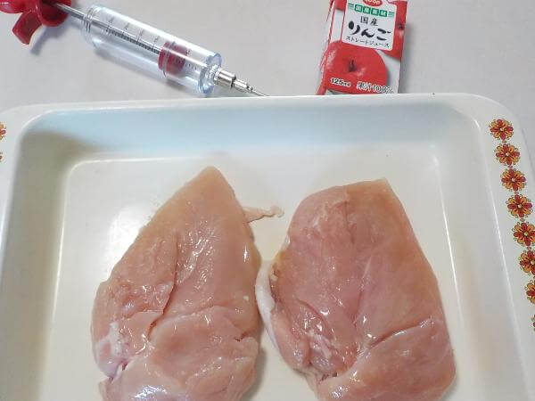 鶏むね肉にりんごジュースを注入します。