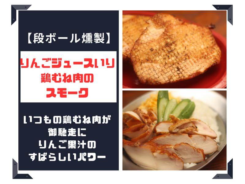 鶏むね肉にりんごジュースを注入してから、燻し焼きあげるレシピを書いています。
