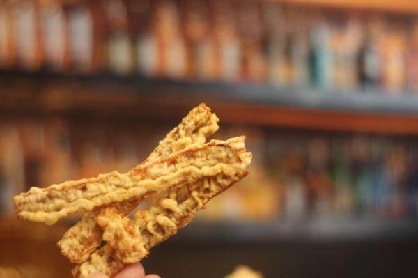 炭の遠赤外線で焼かれた、天かすの表面は、ビーフジャーキーのようにしっかりとした質感。