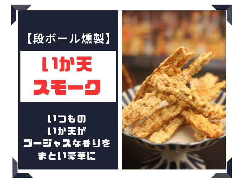 いか天を買ってきて、袋をあけ、燻煙たちのぼる段ボールにいれるだけ。初心者むけのレシピといえます。