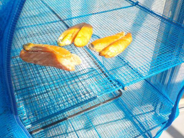 そのうえに網をのせ乾燥させたたらこをのせます。