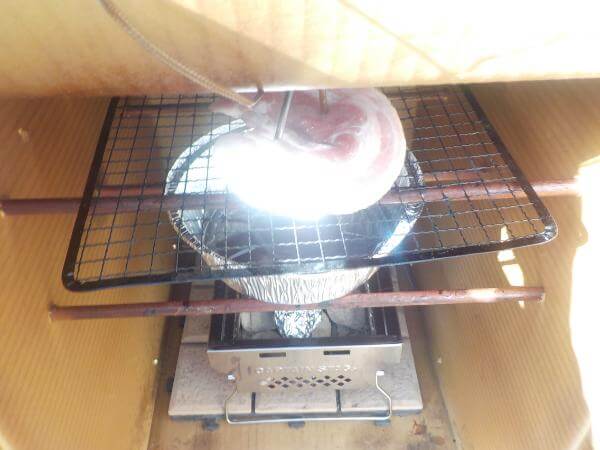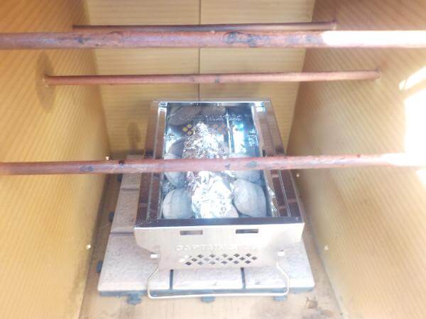 温度があがらないときは、炭を追加して段ボールのなかの温度をあげましょう。