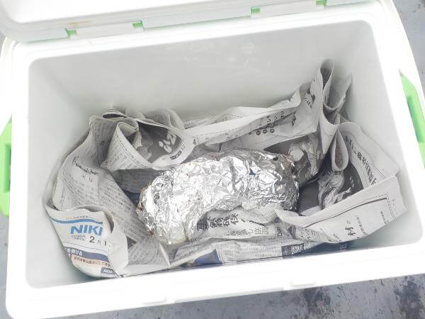 燻し焼きあげた豚肉をアルミホイルでくるみ、新聞紙をいれたクーラーにいれゆっくりと熱をさましました。