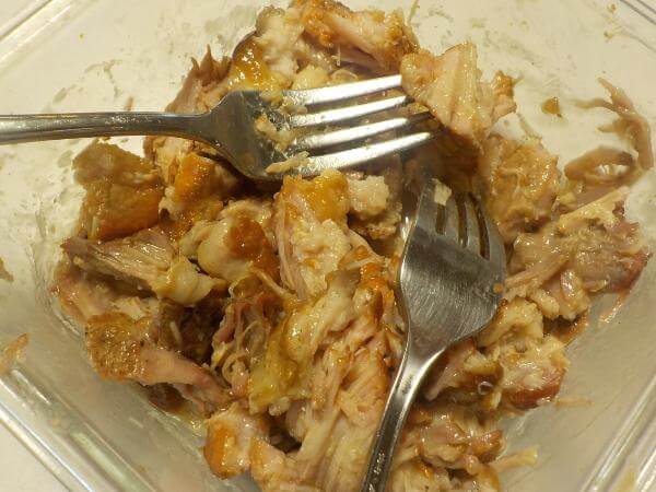 手で触れる熱さのうちに、こまかく豚肉を裂けばプルドポーク風の完成です。