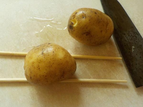 そこで、ジャガイモのしたに割りばしを二本ならべます。