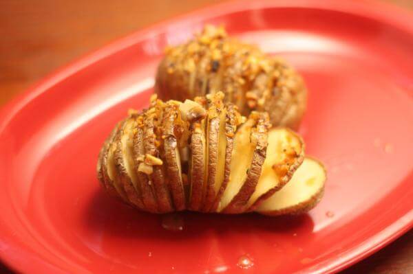 ポテトを切らないように切れめをいれ、蛇腹のようにつなげ、そのスキマに調味料をたらしこみ焼きあげるレシピです。