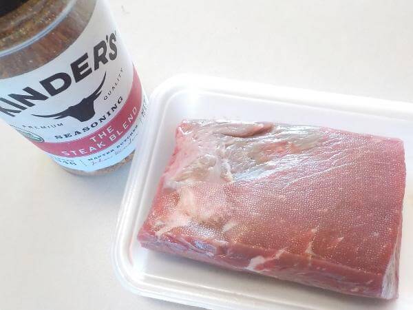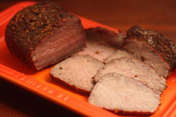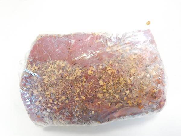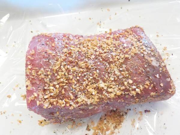 牛肉の塊に調味料をまぶし、すこし寝かせてからスモークチップで燻しあげるレシピです。