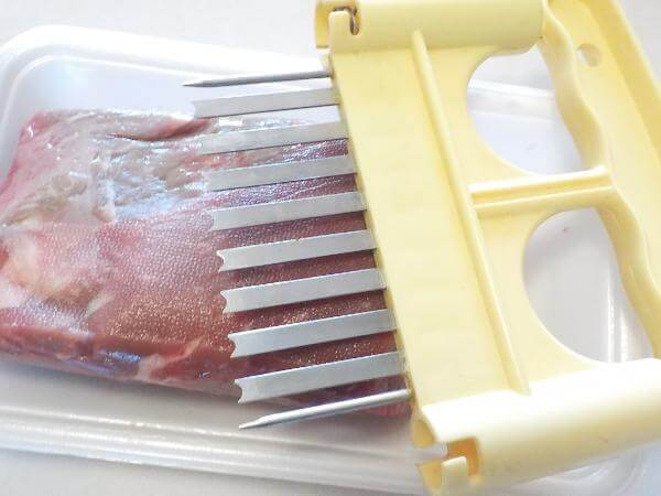 牛肉に穴をあけておくと、なかまで調味料が浸透しやすいです。