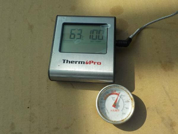 温度があがりすぎないように温度計を刺しておくと、自分ごのみの肉質に調理することができます。