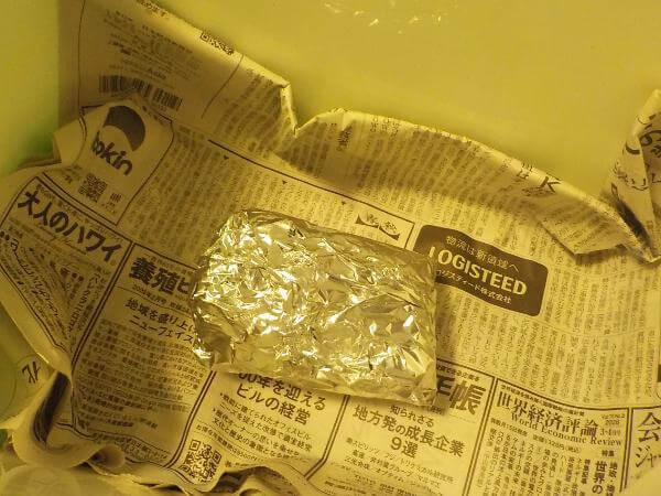 アルミホイルでローストビーフをつつみ、新聞紙をひいたクーラーのなかで温度をさげました。