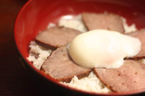 ローストビーフよりも、すこし焼肉よりの質感。白いご飯と黒い牛肉との相性やよし。