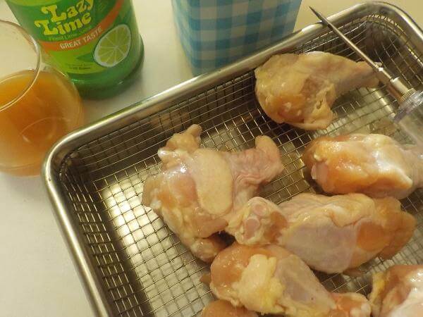 スモークチップで燻すまえに、オレンジジュースとライム果汁を手羽元に注入しました。