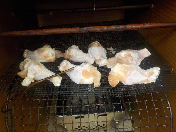 鶏肉は炭でダイレクトに焼きあげるよりは、火元から離してあぶったほうがいい感じに燻すことができます。