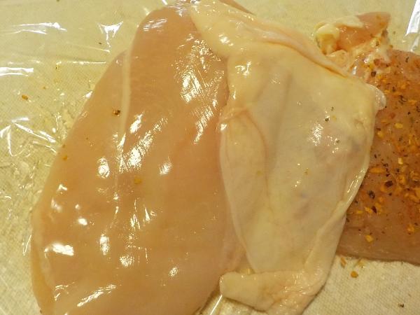 鶏むね肉にお好みの調味料や香辛料をすりこんでください。