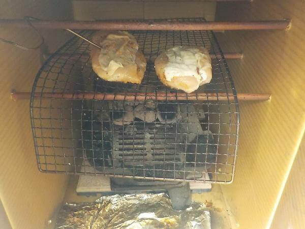 また、鶏の脂が炭におち、猛烈な火をあげず、段ボールが燃えません。