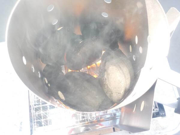 煙突効果で着火剤の火を巻きあげ、火力が分散しないように炭を均等に燃やし火をつけます。