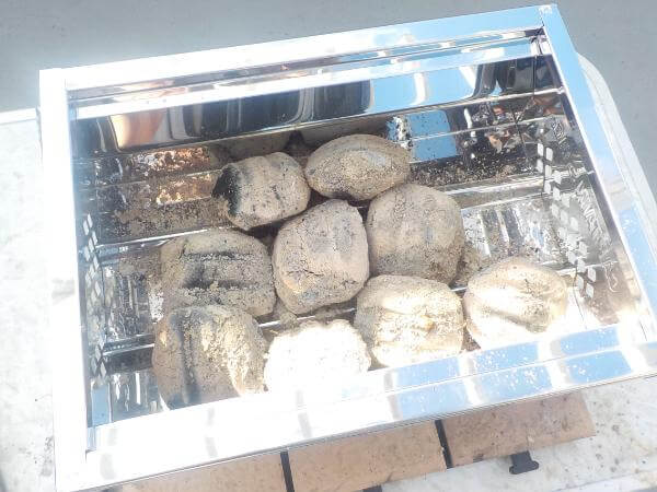着火剤から火がでなくなったころ、なかを覗き込むと、黒い炭の表面が白くなり、下部は赤く輝いています。