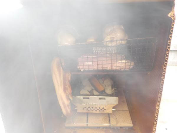 鶏肉から豚肉、鮭などの魚介類を燻製できます、ウッドチャンクを熱源に放りこめば。