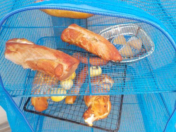 干物・乾燥ネットにいれ風にあてることで燻製の香りが落ちつき、いい塩梅の風味になります。