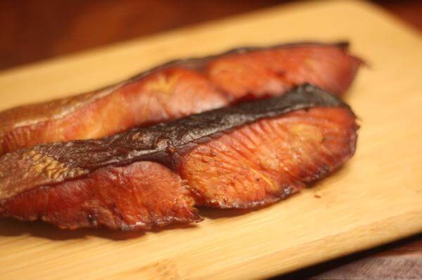 燻製がおわったばかりの食品は煙が苦く、すっぱいです。